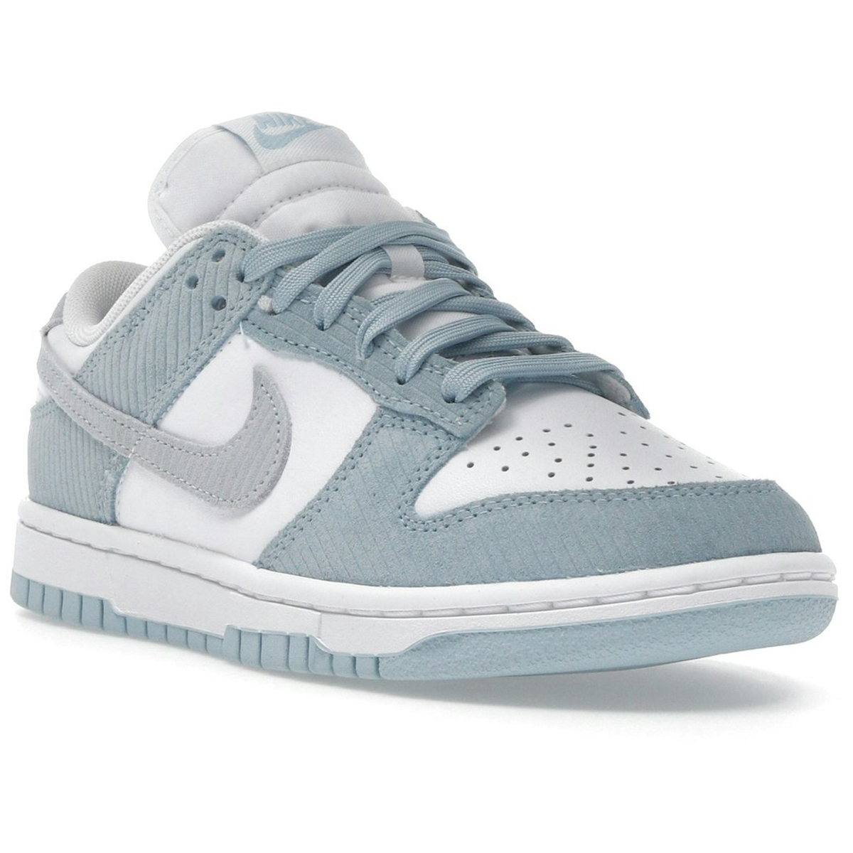 Nike Dunk Low Light Armory Blue Corduroy är en modern sneaker med retrokänsla. Modellen har en vit läderbas med overlays i ljusblå corduroy som ger skon en speciell textur och unik karaktär. Den blå Swooshen och detaljerna på hälen skapar en snygg balans i designen. Med låg silhuett och vadderad krage är komforten säkrad för vardagsanvändning. En stilren men ändå annorlunda Dunk som passar många outfits.