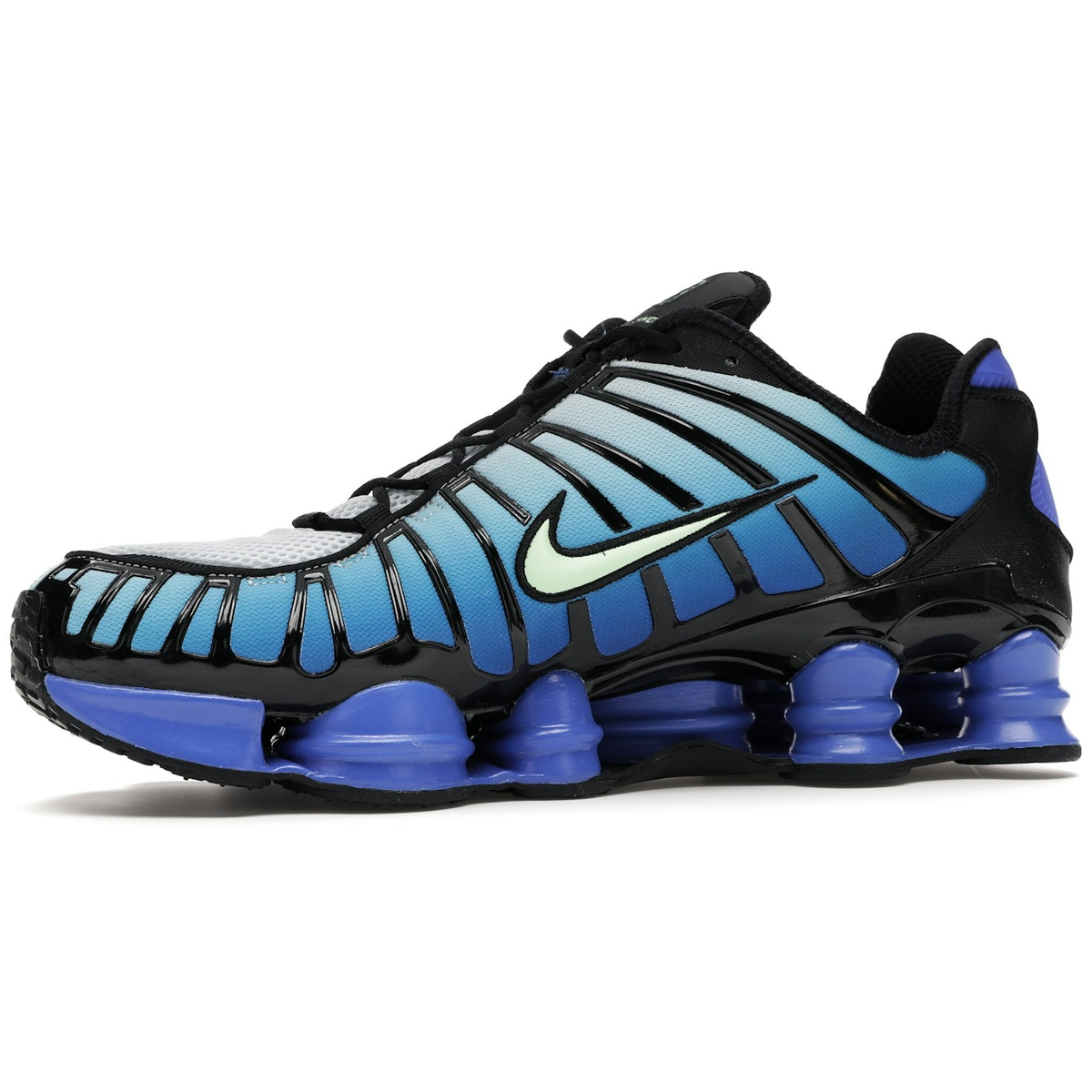 Nike Shox TL Vapor Green Racer Blue presenterar en dynamisk blå gradientovandel som går från ljus till mörk, kombinerad med svarta TPU-överlägg och mesh för struktur och stöd; de subtila vapor green Swooshes tillför en fräsch touch, medan den fullängds Shox-sulan i matchande blå nyanser säkerställer en responsiv och bekväm upplevelse – en sneaker som balanserar teknisk design med distinkt stil.